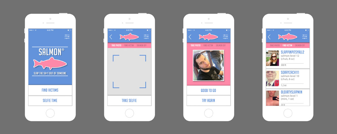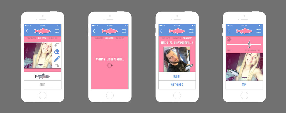 Salmon is a humor based mobile game. I created Salmon along with Bennett Nestok and Zhao "Lillian" Qingjian while in graduate school. Salmon was based off our research into humor and technology. The project evolved from an app to wearable technology. The Salmon project has made an appearance at International Association of Societies or Design Research conference in Brisbane, Australia and it was presented at the Humor Research Conference in Austin, Texas. Take a look at our process book to get a full understanding of the project.